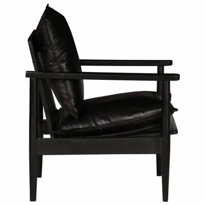 Le fauteuil est fait de bois d’acacia massif qui a reçu une finition teintée noire par polissage, peinture et laquage pour lui donner un aspect raffiné. Cette chaise est recouverte avec du cuir de chèvre souple et rembourrée avec de la mousse épaisse pour une excellente expérience d’assise.